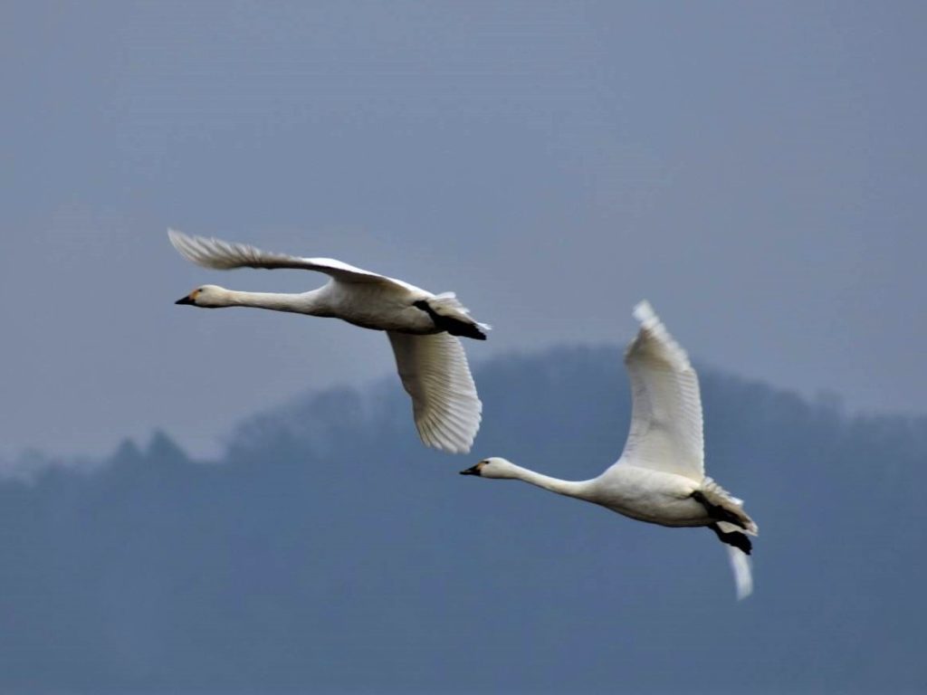 並んで飛んでいるコハクチョウ