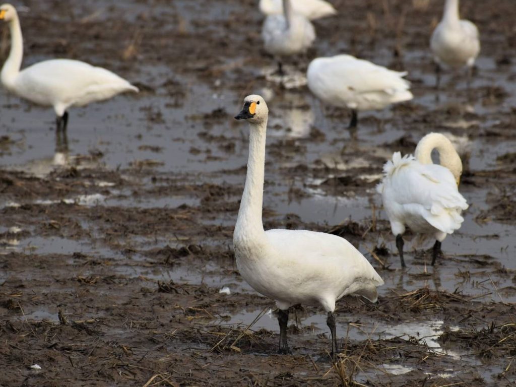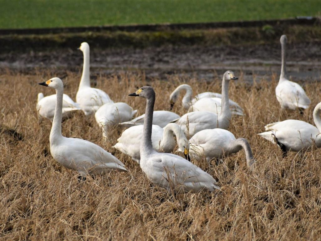 水田で休憩中のコハクチョウ