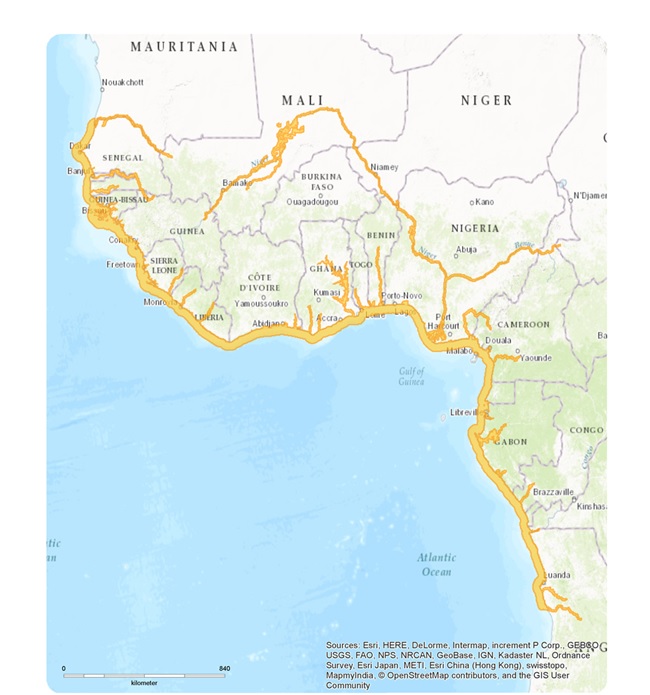 アフリカには推定10,000頭未満のマナティーがいます。分布は、以下のとおりです(オレンジ色部分)。
