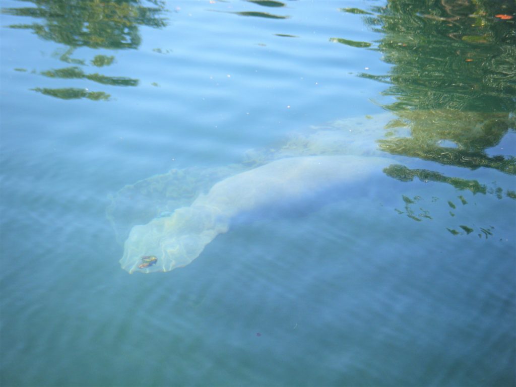 クリスタルリバーのマナティー。皮膚はゾウのような感じで、口と鼻の周辺にはひげが生えています。