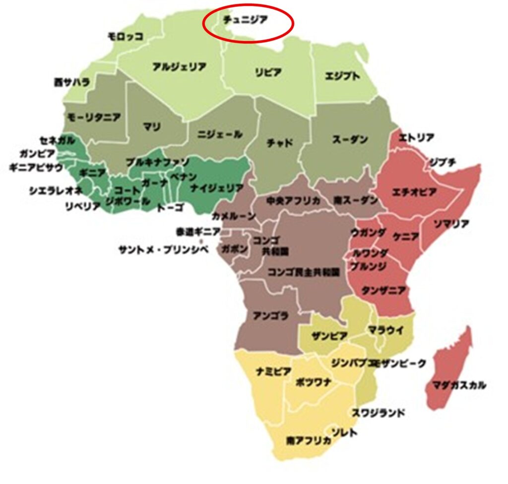 (補足)チュニジアは北アフリカに位置する共和制国家。日本の4割ほどの国土をもつ。地中海のリゾート地や多様な文化と遺跡、砂漠などがある観光地として知られている。