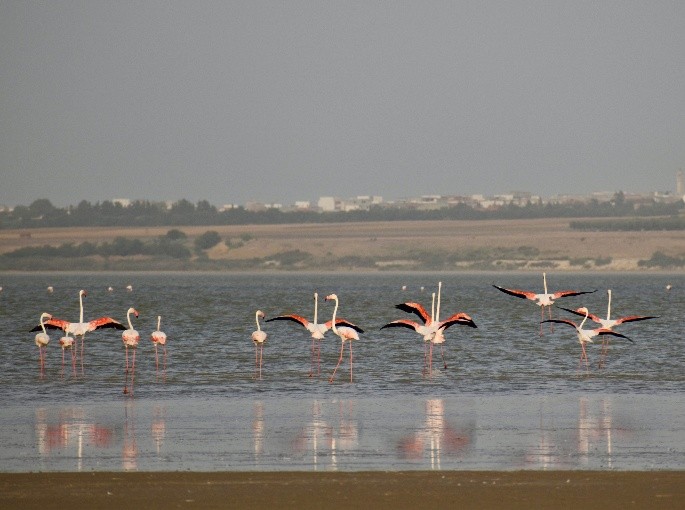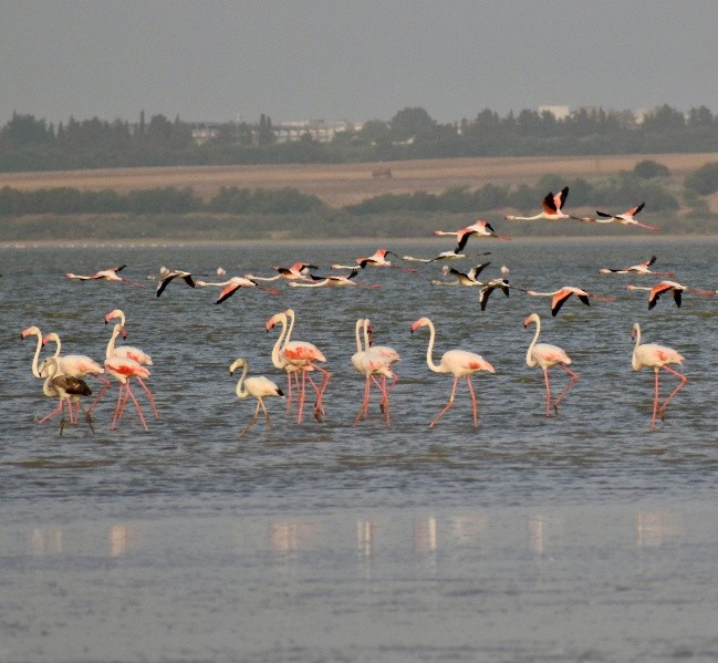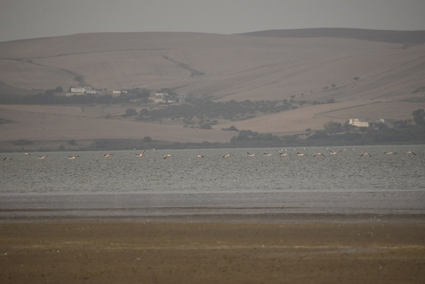 オオフラミンゴが100羽以上が飛来していました。夕暮れ時だったので、オオフラミンゴは群れをなして飛び交っていました。以前はダム建設で塩分バランスが壊れたため、フラミンゴが激減した時代もあったようですが、今は回復基調にあるそうです。