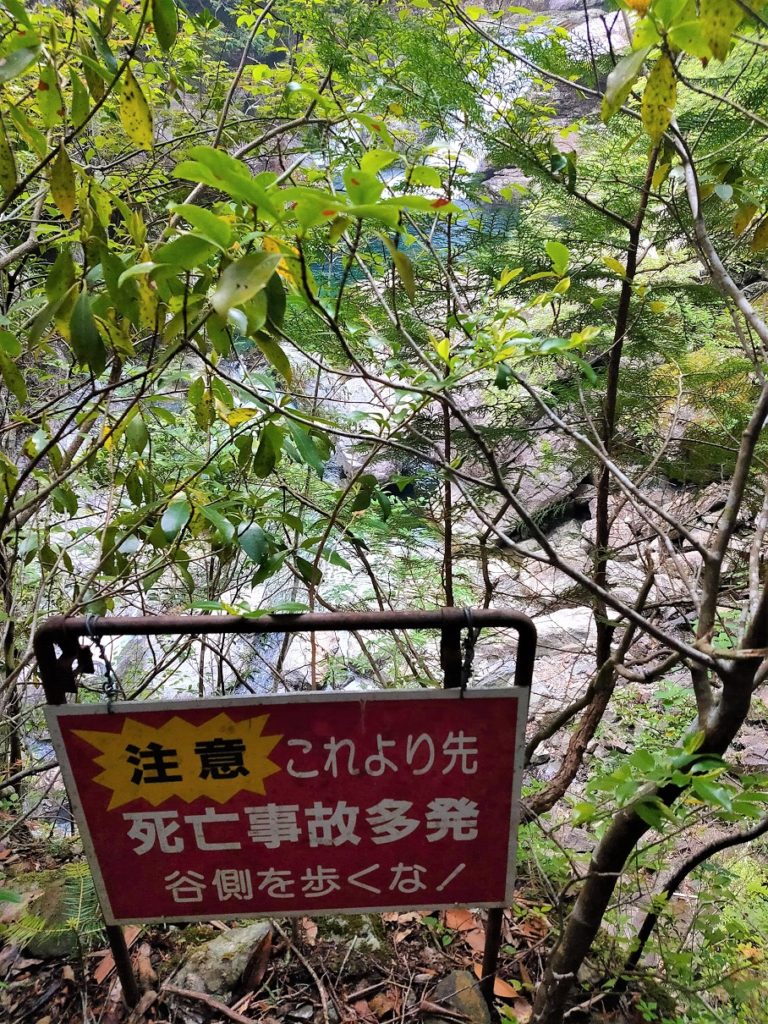 大杉谷の登山道は渓谷に沿った道で、嵓もあり大変困難な道です。1940年に一般登山者を受け入れ始めたそうです。地図上の標高差はありませんが、上り下りが続く登山道を歩くため、谷歩きは平易ではありません。吊り橋や鎖場も多くあります。事故も多く発生しており、大杉谷登山センターや管理者等関係者が登山者へ注意を呼び掛けています。遭難した場合の救難費用は登山者個人負担です。1979年には吊橋が落ちて墜落死亡事故が発生し、訴訟問題になりました。その後環境省(当時庁)は1983年まで通行止めにして本格的に登山道を整備し直しています。