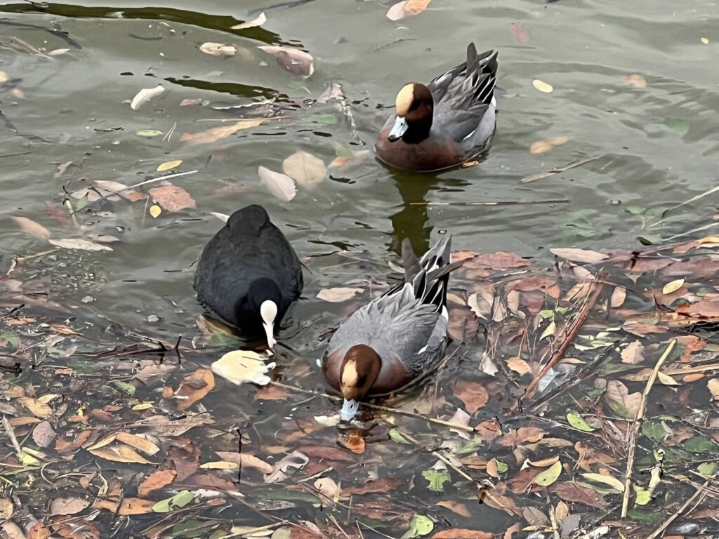 Fukada Pond. It is said that this reservoir was built during the Asuka period. The birds in the photo are a Wigeon and a Coot.