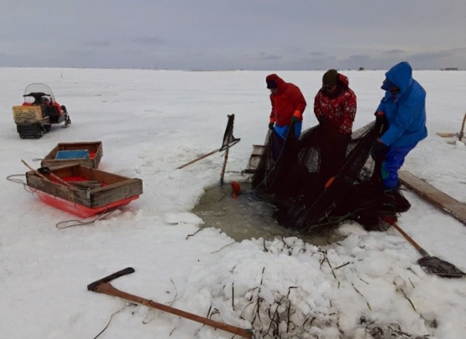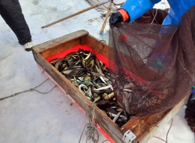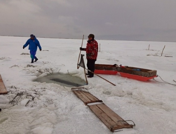 氷の下で網を広げるために、開けた大きめの穴から約5mごとに小さな穴を数か所あけます。そこから冷たい水に手を突っ込んで、棒などで網を広げていきます。網の長さは45mになるものもあるようです。仕掛けの網は魚が入ったら出にくい作りとなっており、魚が入るのを1日待ちます。