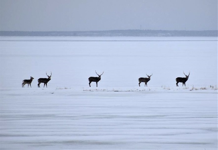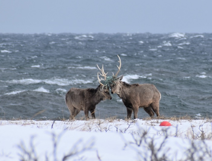 エゾシカ、キタキツネ、オコジョ、イイズナ、ヤチネズミなどが生息し、半島周辺の海域にはゴマフアザラシ、ネズミイルカ、カマイルカ、ミンククジラなどが現れるそうです。2021年3月訪問時には、エゾジカ2頭の角が同じ漁具に絡まり大変なことになっていました。ネイチャーセンターの方に相談しましたが、どうしようもないとのことでした。
