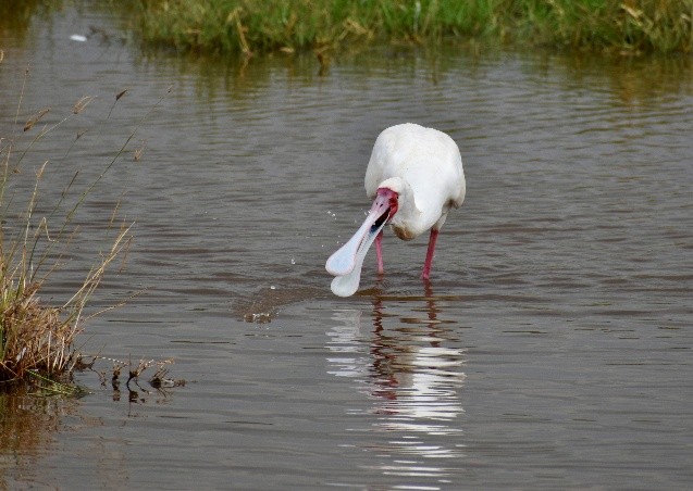 アフリカヘラサギ(African Spoonbill)全身白く、顔が赤く、足はピンク色で、くちばしの先端がへら状に広がっています。ナクルル国立公園のヘラサギはアフリカヘラサギです。日本ではクロツラヘラサギやヘラサギをまれに見ることができます。出水の鶴に交じって、ユーラシアヘラサギを見たことがありますが、本当にラッキーでした。