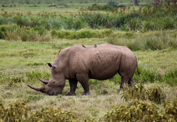 シロサイ(White rhinoceros)小鳥(ウシツツキ)が背中に乗っています。ナクルル国立公園ではシロサイとクロサイの両方がいます。クロサイは木の葉や枝を食べるそうです。ビッグファイブの一つ。