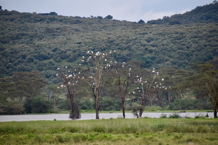 ぺりカンのなる木 ナクルルには多くのモモイロペリカンが飛んできています。安全な木の上で集団で休息しているそうです。ナクルルにはハイイロペリカンもいます。