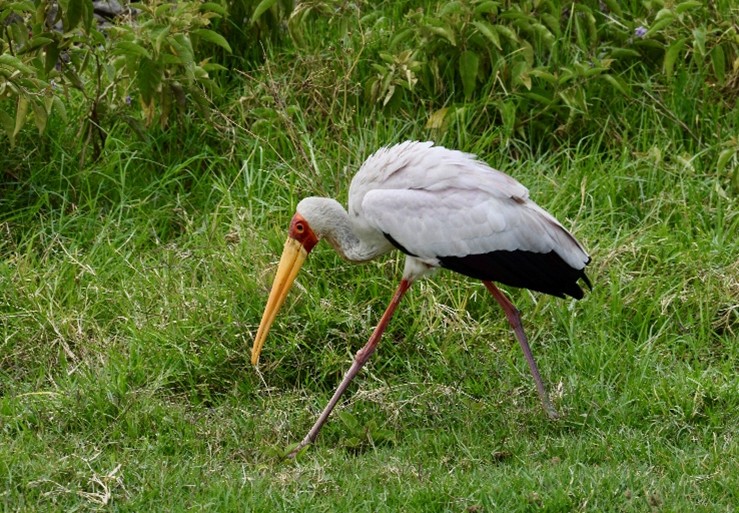 アフリカトキコウ(Yellow billed Stork)長くてまっすぐな黄色の嘴、赤い顔が特徴的です。嘴は自動ドア方式で、何かが触れた瞬間に反射的に捕まえるそうです。