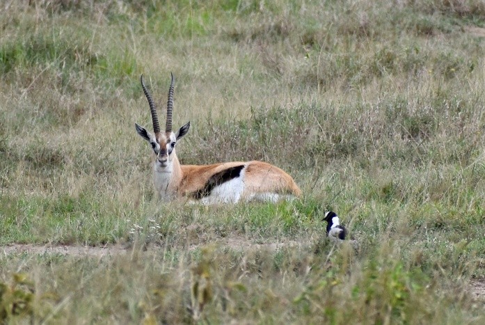 トムソンガゼル(Thomson’s gazelle)インパラより一回り小さい雄のトムソンガゼルです。チーターの主食ですが、時速80㎞で走り、チーターと正面勝負できるそうです。赤ちゃんも生まれて数時間後には走ることができるそう。