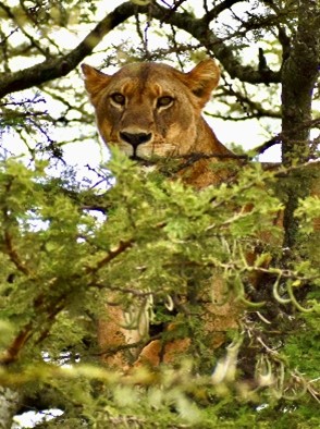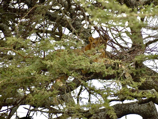 ゆっくり鳥を見ていると、ガイドにガイド仲間からライオンがいると連絡が入りました。近くだったので、急いでライオンがいる場所に移動したところ、数台のサファリカーが止まっており、その近くの木の上にライオンがいました。雌ライオンが木の上でゆったりしています。木の枝が邪魔になり、なかなか良い写真が取れません。雌ライオンはあまり動きませんでしたが、20分程見ている間に、向きを変えること1回、立ち上がること1回、伸びをすること1回見ることができました。