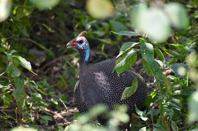 ホロホロ鳥(Helmeted guineafowl) 茂みから歩いて道路に現れました。鳴き声がホロホロ聞こえることから名前が付いたそうです。時速35㎞以上で走り、飛べるがあまり飛ぶことはないそうです。欧州では高級食材です。