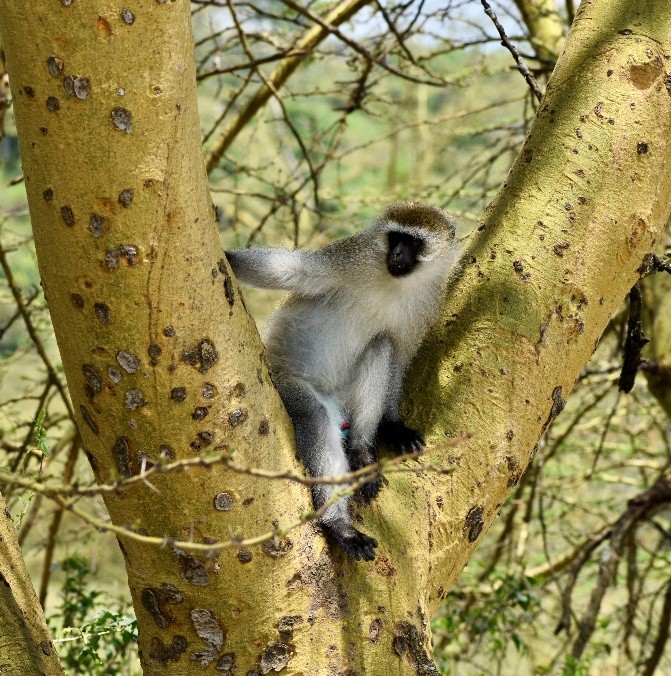 ベルベットモンキー(Vervet Monkey)オスの陰嚢が鮮やかな水色をしています。陰茎は赤だそうです。かなりずるがしこく性格が悪く、人間に近いようです。人間用ワクチンや神経研究に利用されいるそうです。