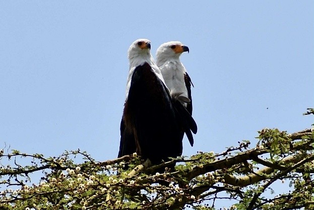 サンショクウミワシ(African Fish Eagle)日本や東アジアのサンショクウミワシに似ています。主に魚を食べるワシで、一夫多妻制。ケニア・ジンバブエ・ザンビアの国鳥。アフリカ版ハクトウワシ。