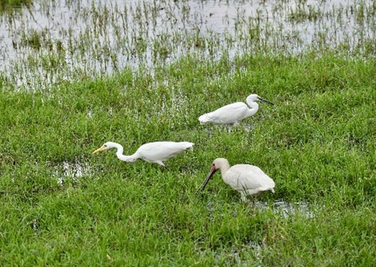 サギ類 この写真のサギは3種類います。コサギ(黒い嘴)、チュウサギ(黄色い嘴)、アフリカヘラサギ(顔の一部分が赤く、黒いへら状の嘴)です。